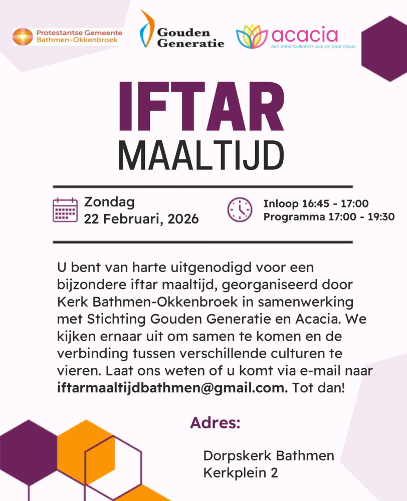 Op 22 februari kunt u, samen met geloofsgenoten uit christelijke en islamitische tradities, aanschuiven aan een Iftar maaltijd, die georganiseerd wordt in de Dorpskerk te Bathmen. Schuif aan vanaf 16:45, de maaltijd begint om 17:00. We hopen dat het, net als de vorige editie, een warme en inspirerende bijeenkomst zal worden. | ||